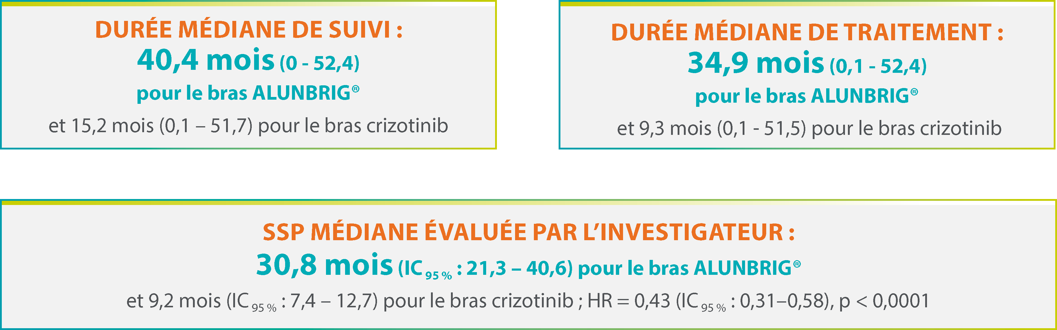 # Médiane de suivi : ALUNBRIG® : 40,4 mois et crizotinib : 15,2 mois