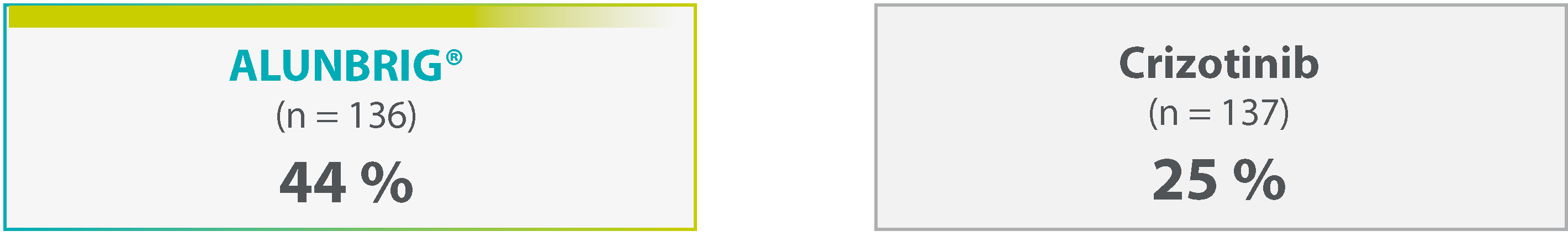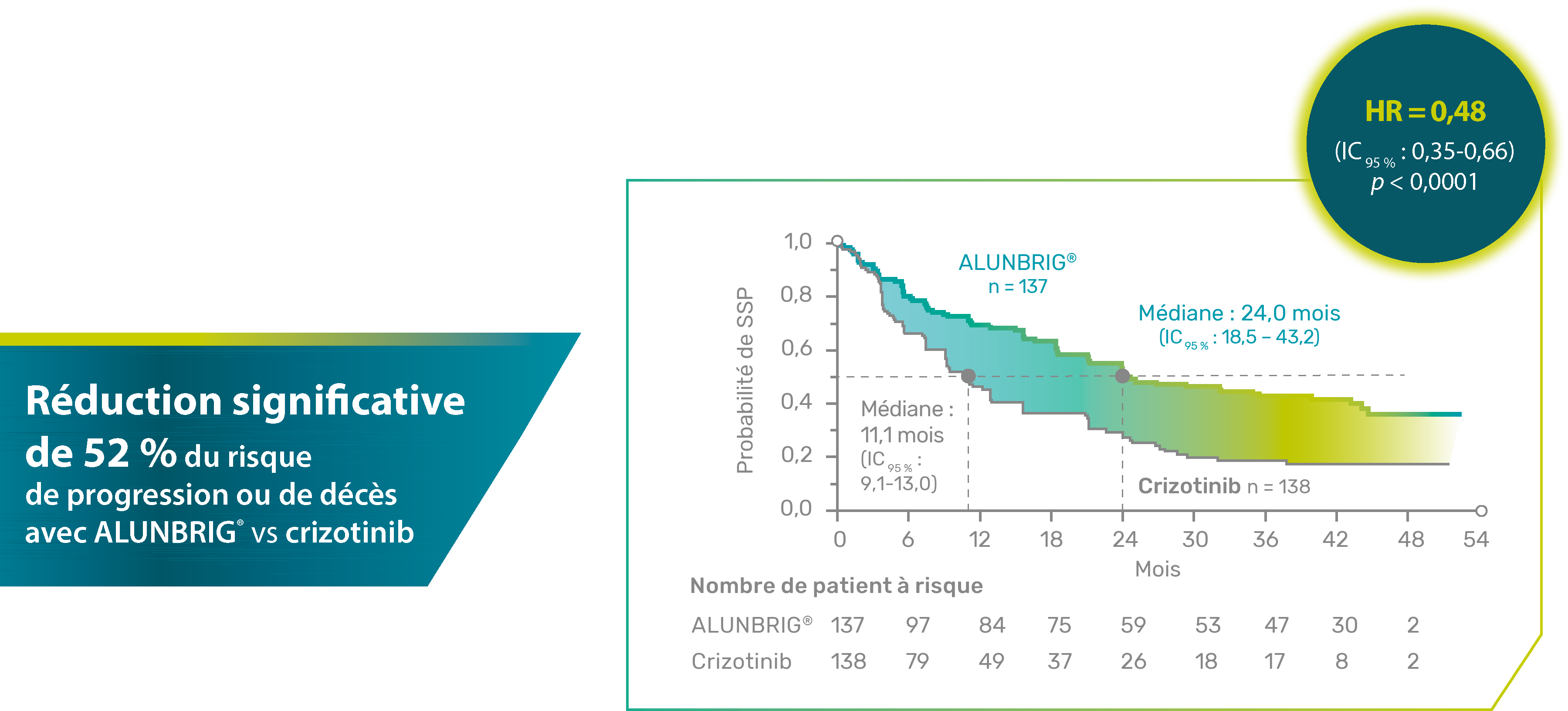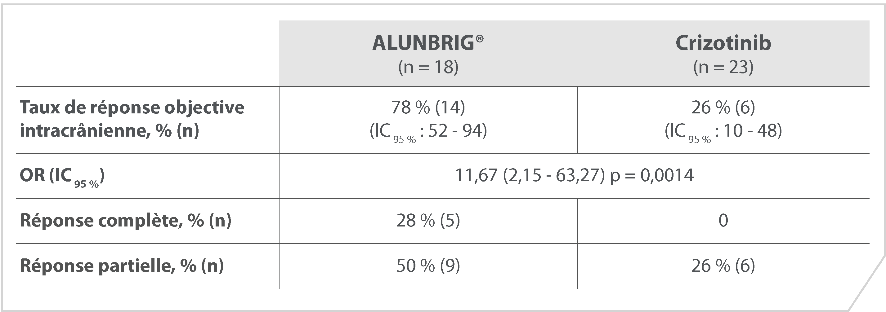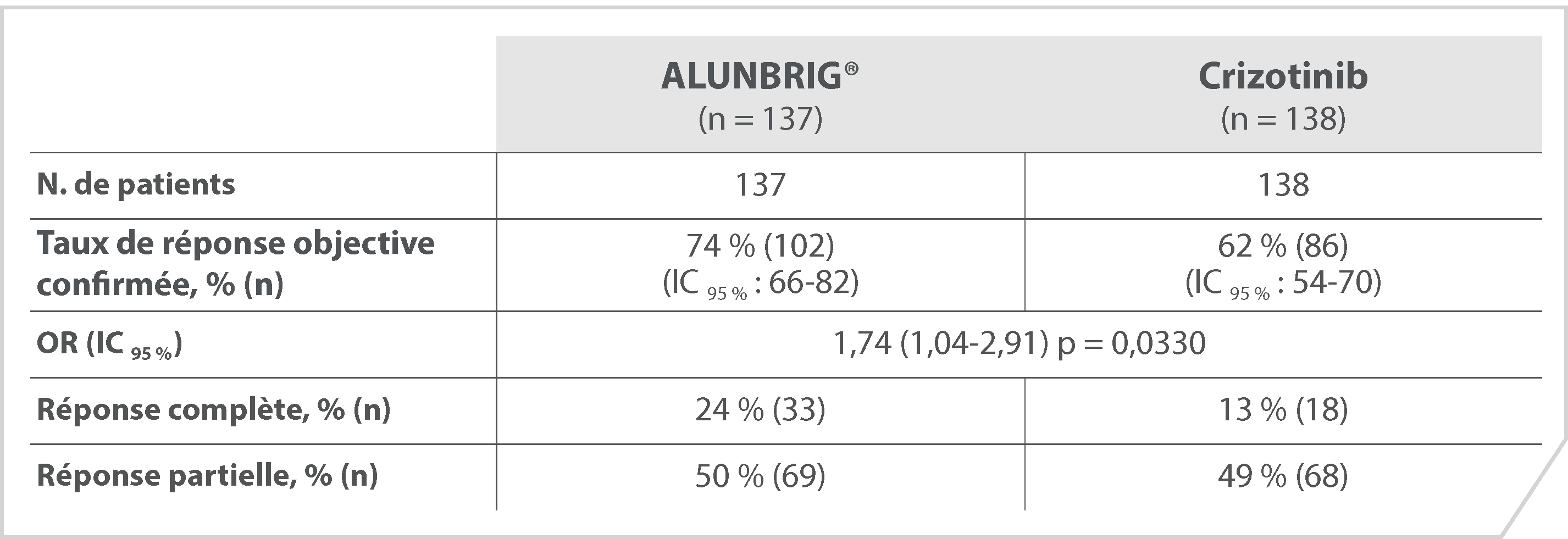 Survenue d’un évènement (progression, décès ou radiothérapie palliative) chez 53 % des patients traités par ALUNBRIG® et 67 % des patients traités par crizotinib