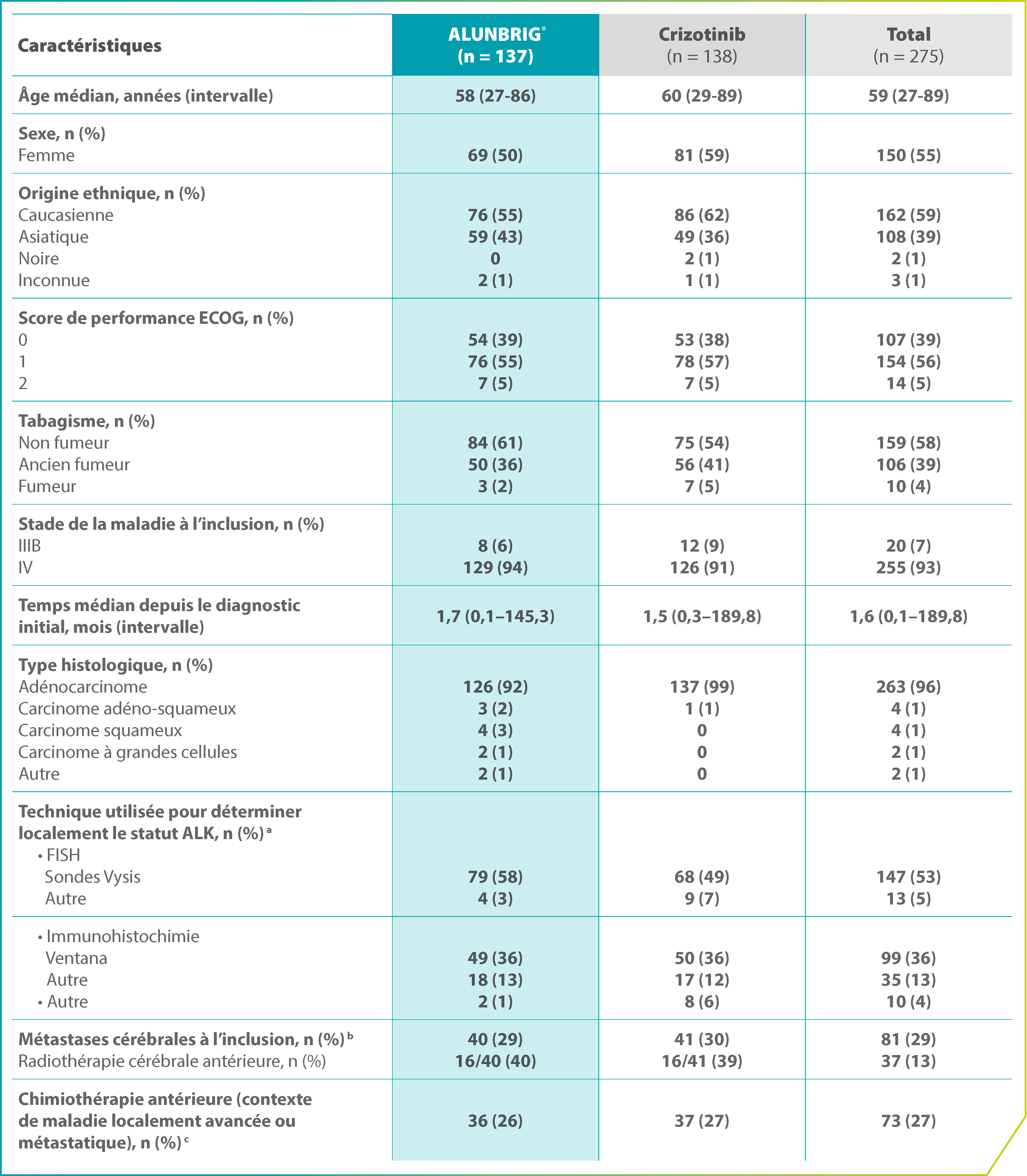 * La somme des pourcentages n’est pas égale à 100 à cause des arrondis. a Statut ALK+ confirmé par 1 ou plusieurs techniques. b D’après l’évaluation de l’investigateur. c La chimiothérapie antérieure a été définie comme l’achèvement d’au moins 1 cycle entier de chimiothérapie dans le contexte de maladie localement avancée ou métastatique.