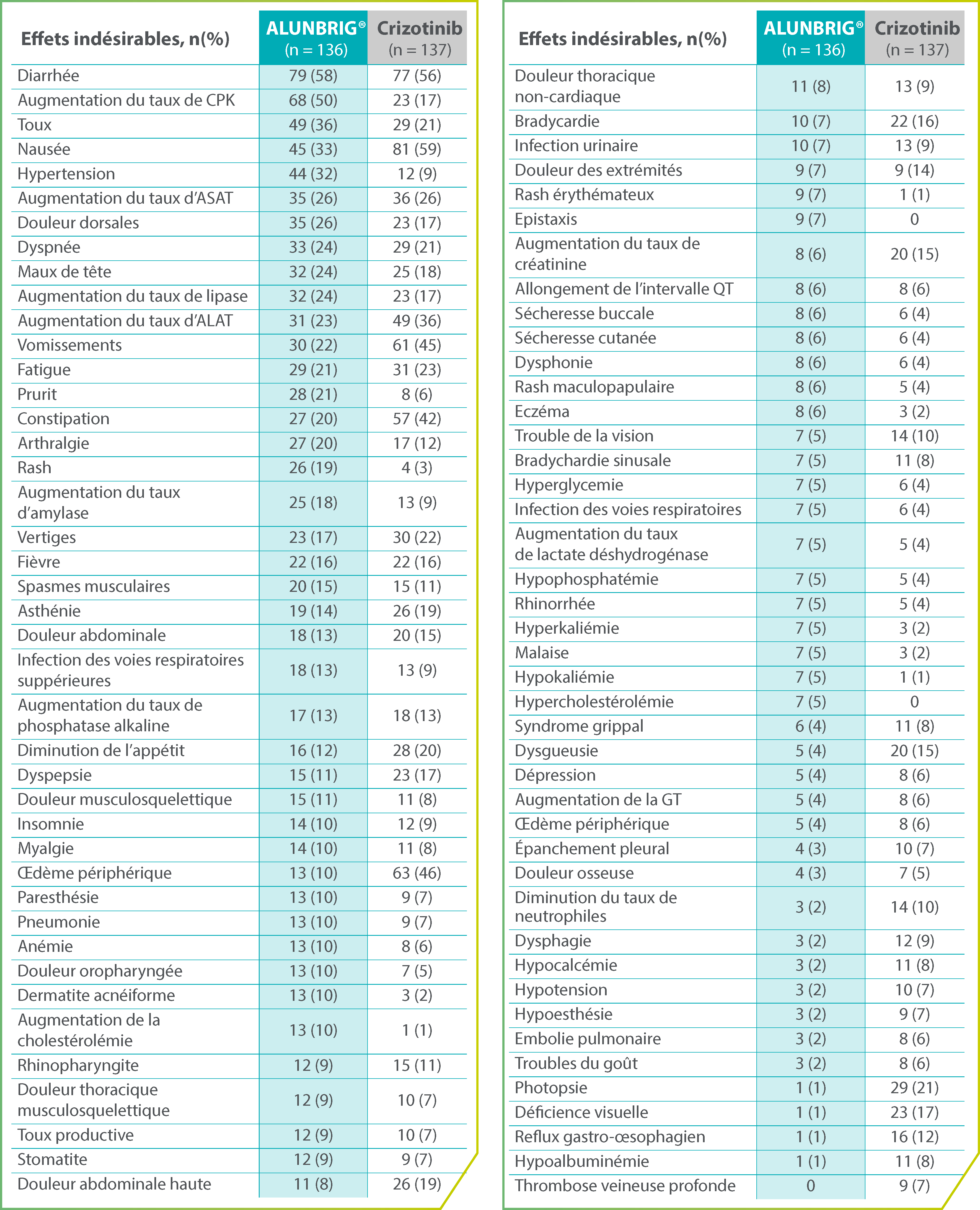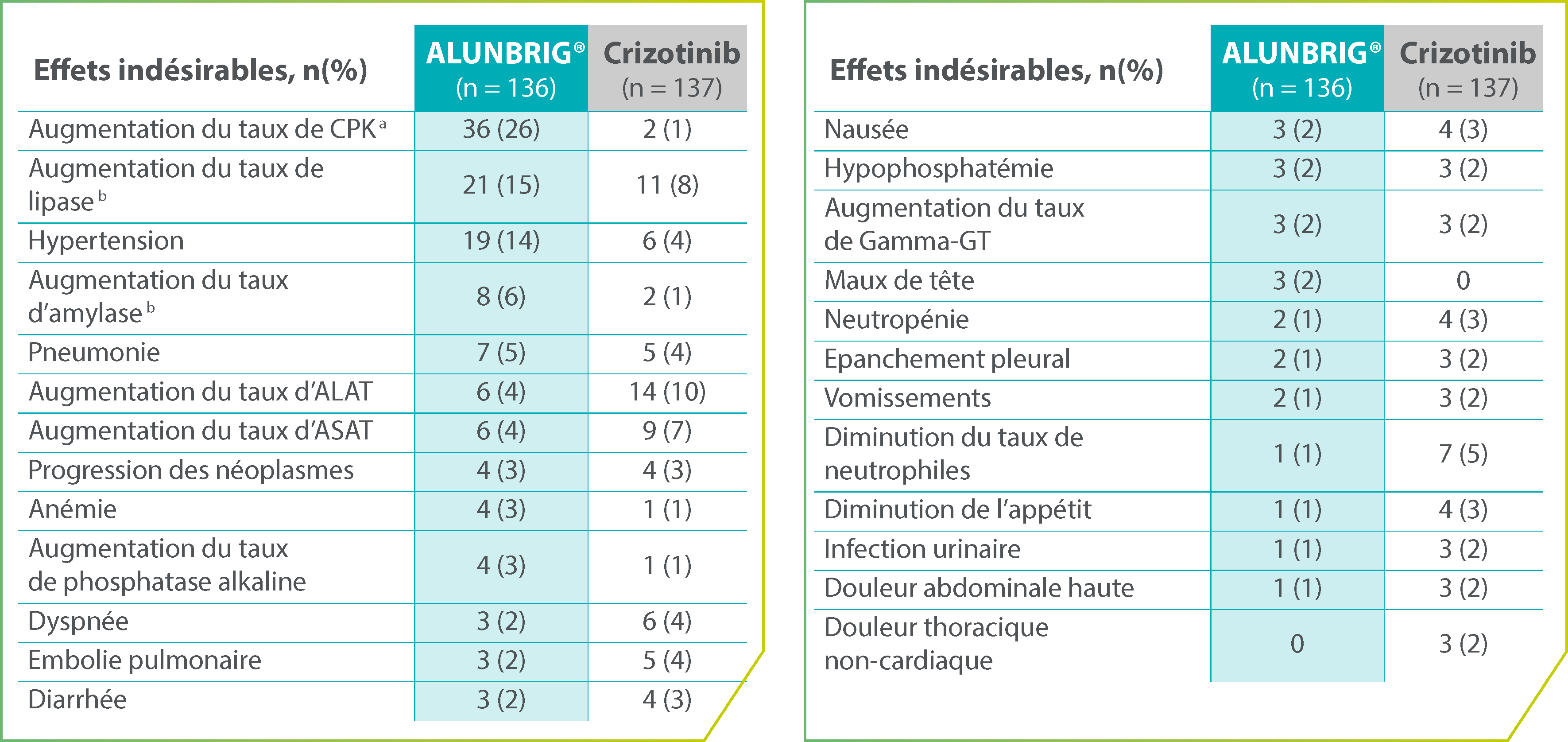 a Des myalgies ont été rapportées chez 14 (10 %) et 11 (8 %) patients dans les bras ALUNBRIG® et crizotinib, respectivement. Des douleurs musculo-squelettiques ont été signalées chez 15 (11 %) et 11 (8 %) patients, respectivement. Aucune myalgie ou douleur musculo-squelettique de grade ≥ 3 n’a été signalée dans les deux bras. b Aucun cas de pancréatite clinique n’a été signalé dans les deux bras.