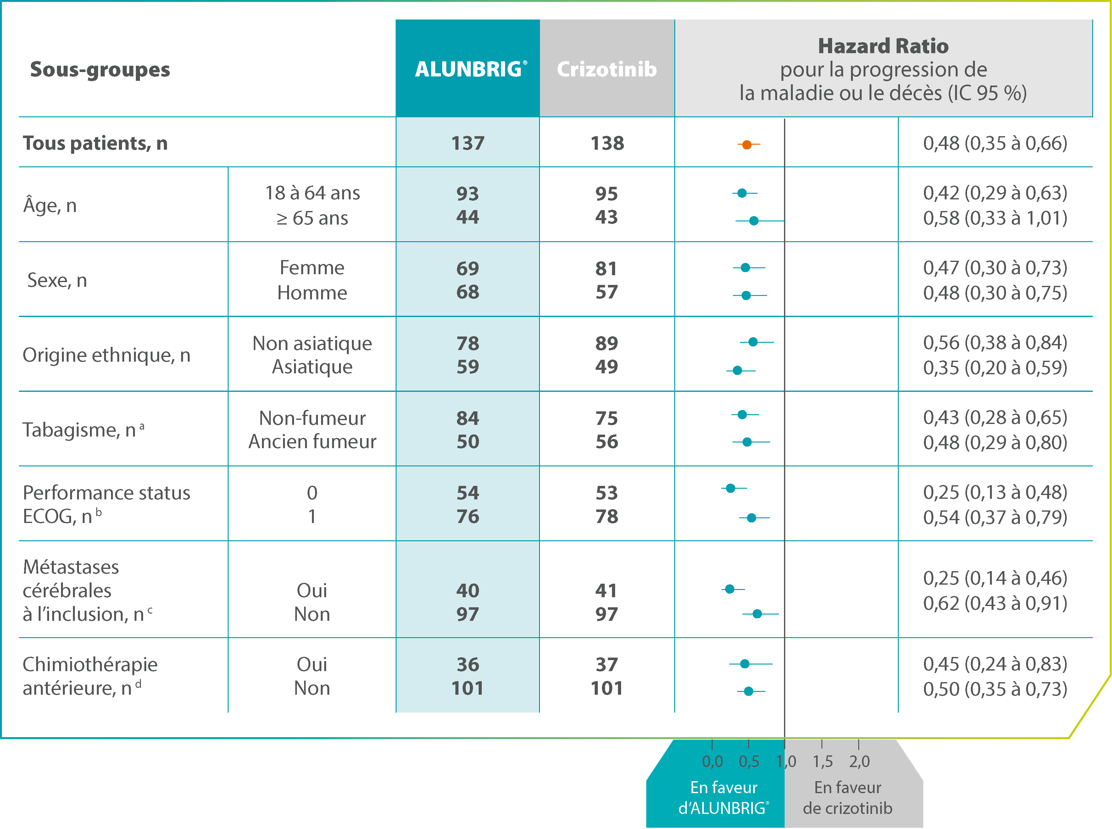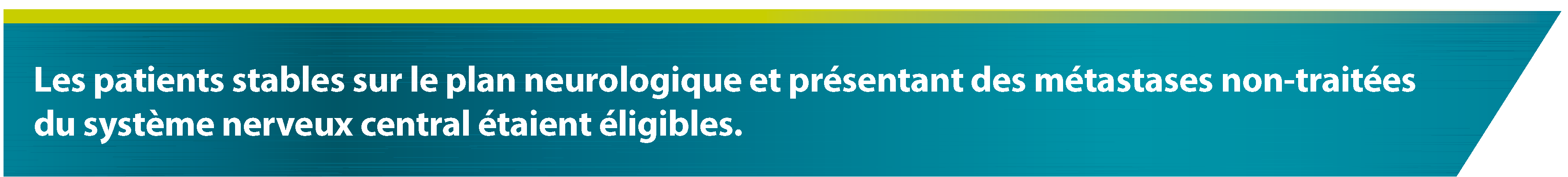 L’analyse en sous-groupes du critère principal était prévue dans le protocole de l’étude clinique et était stratifiée selon la présence de métastases cérébrales à l’inclusion et l’administration d’un traitement antérieur par chimiothérapie.