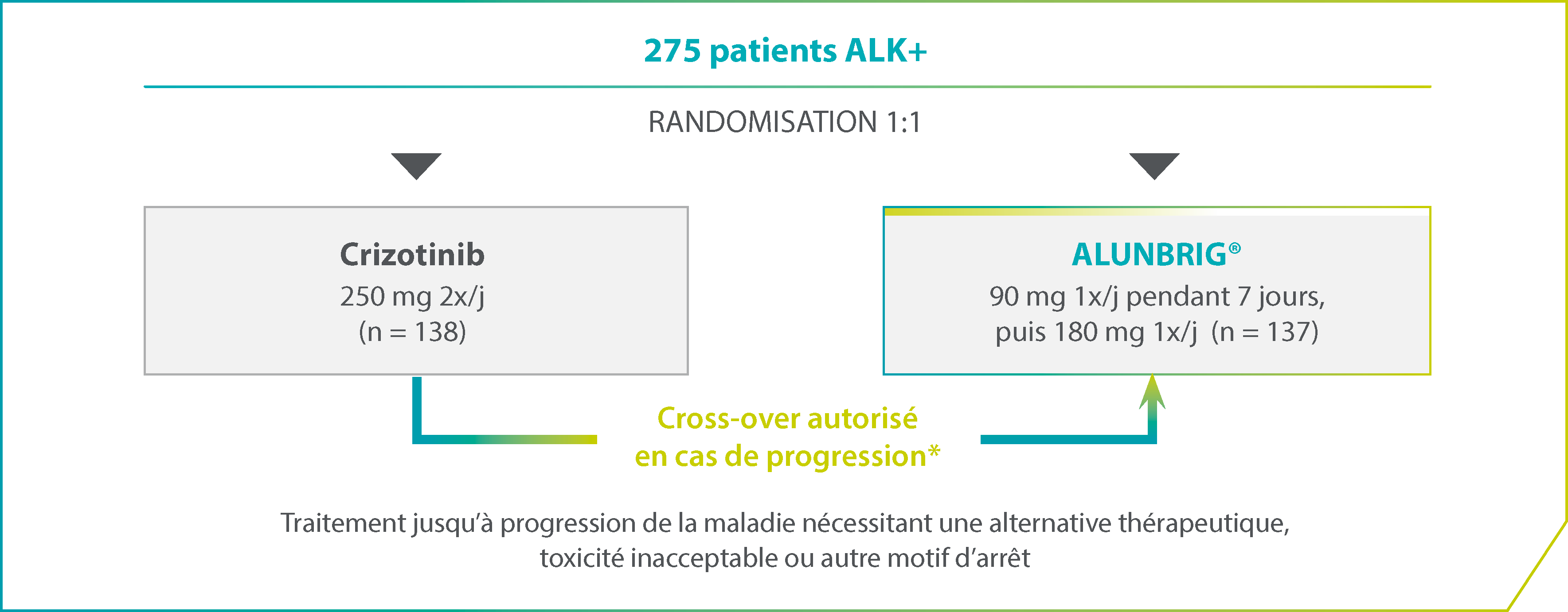 Évaluer l’efficacité et la tolérance d’ALUNBRIG® par rapport au crizotinib chez des patients atteints d’un CBNPC avancé ALK+ non préalablement traités par un inhibiteur d’ALK.