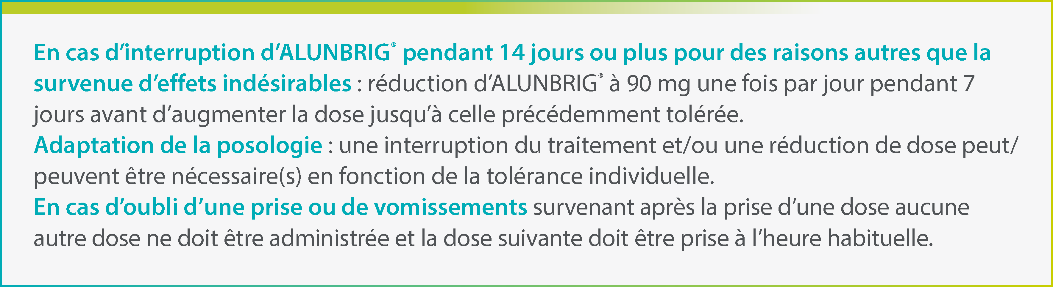 Le traitement par ALUNBRIG® doit être initié et supervisé par un médecin expérimenté dans l’utilisation de médicaments anticancéreux.