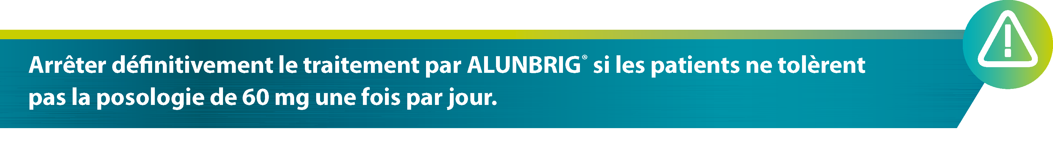 ALUNBRIG® contient du lactose monohydraté. Les patients présentant une intolérance au galactose, un déficit total en lactase ou un syndrome de malabsorption du glucose et du galactose (maladies héréditaires rares) ne doivent pas prendre ALUNBRIG®.